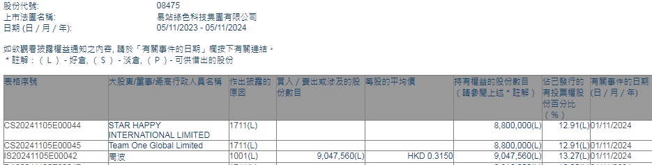 智通财经APP获悉,香港联交所最新资料显示,11月1日,周波增持易站绿色科技(08475)904.756万股,每股作价0.315港元,总金额约为284.998万港元。增持后最新持股数目为904.756万股,持股比例为13.27%。