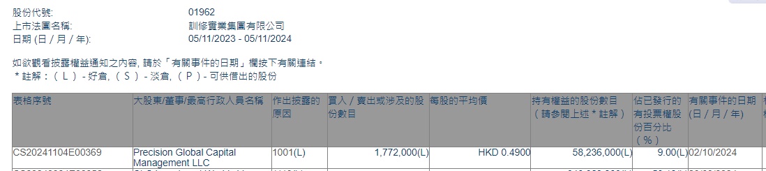 智通财经APP获悉,香港联交所最新资料显示,10月2日,Precision Global Capital Management LLC增持训修实业(01962)177.2万股,每股作价0.49港元,总金额约为86.83万港元。增持后最新持股数目为5823.6万股,最新持股比例为9%。