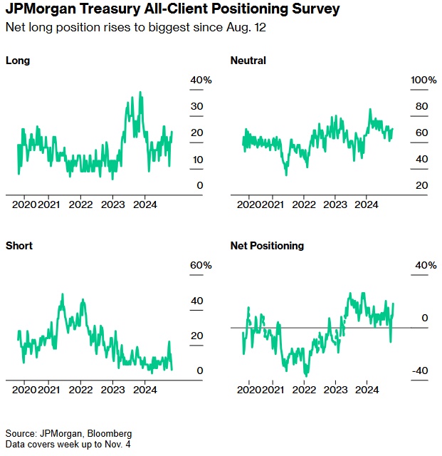 小摩调查结果显示,截至11月4日当周,客户对美国国债的持仓出现了显著变化。具体而言,直接多头仓位有所增加,而空头仓位则相应减少,这一变动使得净多头仓位攀升至自8月12日以来的最高水平。