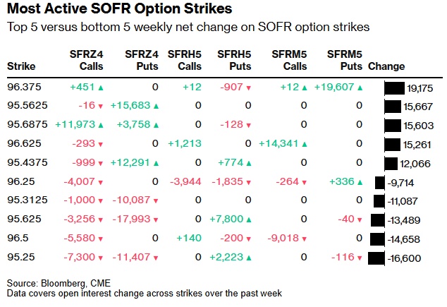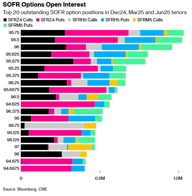 在最活跃的SOFR期权方面,过去一周内,12月24日、3月25日和6月25日等期限的SOFR执行价持仓变化相对平稳。然而,值得注意的是,96.375执行价的未平仓头寸增长最为显著,其中大量资金流入涉及SFRM5 96.375/96.125/95.75看跌期权的买入。此外,95.5625执行价也备受青睐,近期资金流入包括SFRZ4 95.75/95.6875/95.625/95.5625看跌期权的交易。