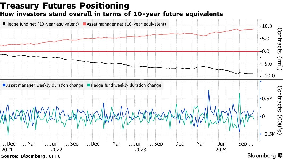 数据显示,截至10月29日当周,资产管理公司在10年期国债期货上的净多头持仓量增加了约182,000份等价物。相比之下,对冲基金在同一报告期内则增加了约86,000份10年期国债期货的净空头持仓量。值得注意的是,资产管理公司在5年期国债期货上的头寸变化最为显著,每增加一个基点风险,其净多头持仓量就增加870万美元。