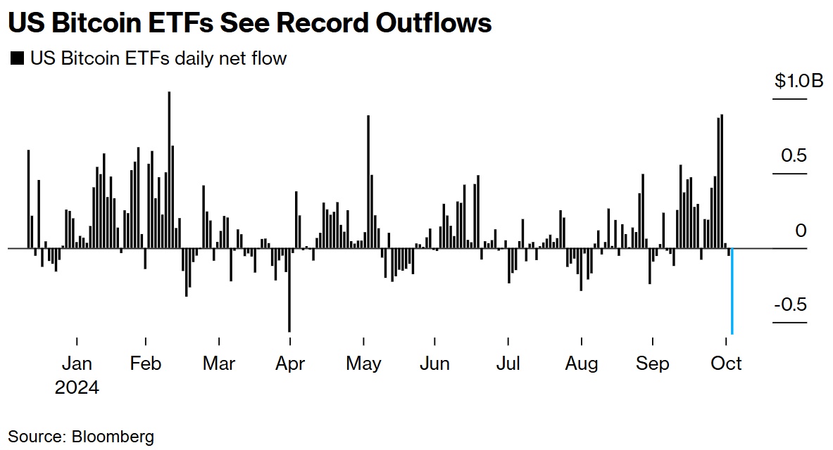 据彭博社汇编的数据,现货比特币 ETF 的投资者在大选前一天就抛售了筹码,周一12只基金的资金流出量达到创纪录的 5.795 亿美元。