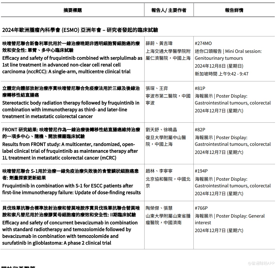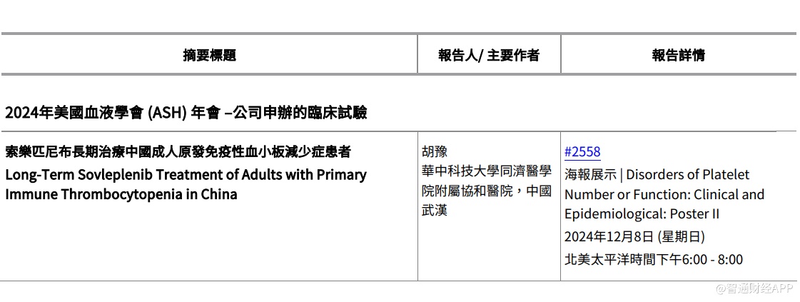 智通财经APP讯,和黄医药(00013)发布公告,索乐匹尼布 (sovleplenib)的ESLIM-01 III期研究以及和黄医药自主研发的化合物的数项研究的最新及更新后的数据将于2024年12月7日至10日在美国圣地亚哥召开的2024年美国血液学会 (ASH)年会,以及2024年12月6日至8日在新加坡召开的2024年欧洲肿瘤内科学会(ESMO) 亚洲年会上公布。