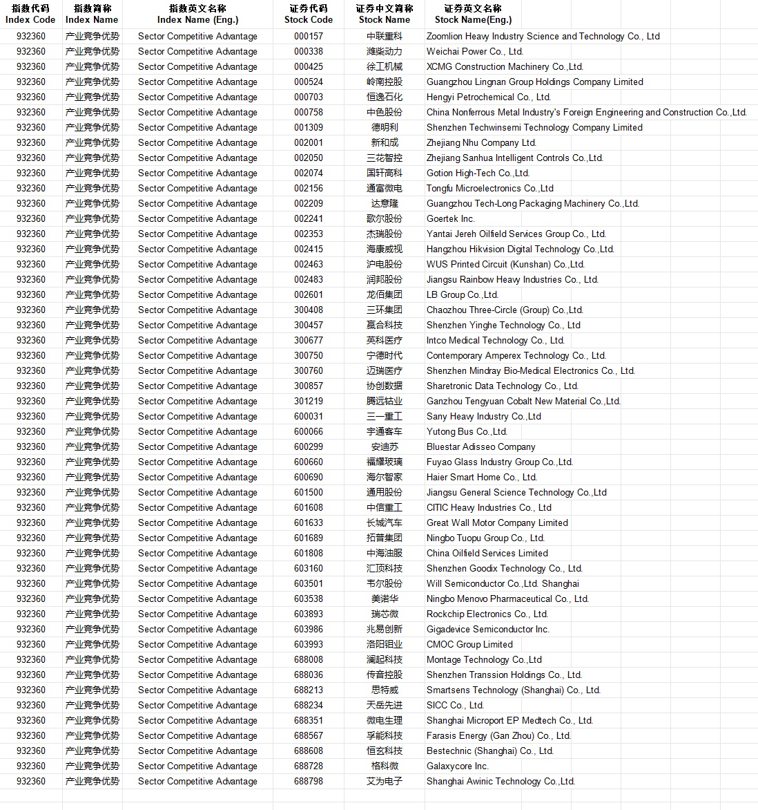 中证产业竞争优势指数选取50只规模较大、盈利能力较好且业务竞争力较强的上市公司证券作为指数样本,以反映具有较强产业竞争优势的上市公司证券的整体表现。指数样本包括中联重科(000157.SZ) 、徐工机械(000425.SZ)、岭南控股(000524.SZ)、中色股份(000758.SZ)等标的。