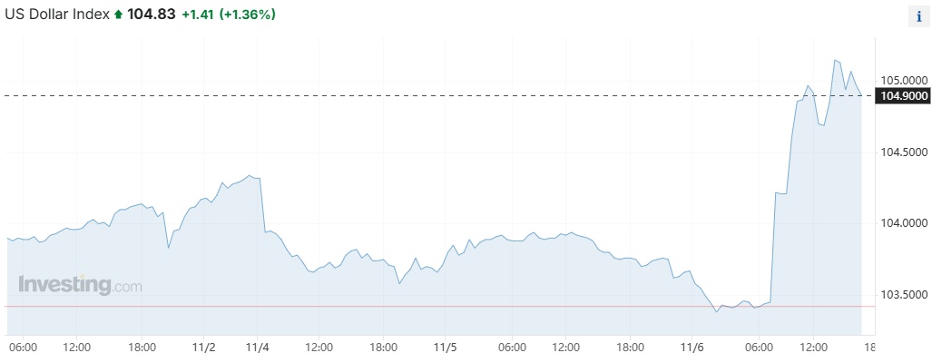 华尔街策略师普遍认为,特朗普的关税政策至少在短期内会支撑美元,损害墨西哥比索等货币。美元指数涨幅扩大至1.36%,报104.83,为7月份来新高。在美元上涨的压力下,亚洲市场石油、大豆和铜价格分别下跌约1.5%和2%以上。包括黄金在内的贵金属价格保持稳定。