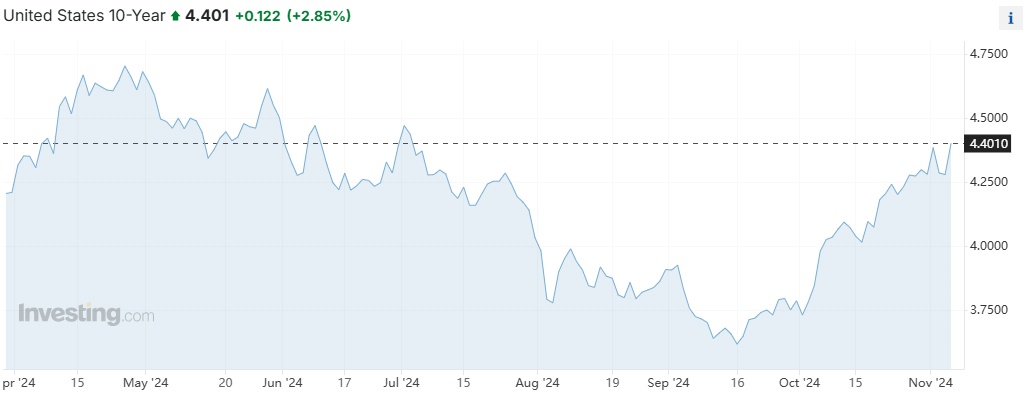 美联储周三开始为期两天的货币政策会议,预计将再次降息25个基点,不过特朗普获胜可能会使美国利率前景复杂化。美债重挫,美国30年期国债收益率上行10个基点,美国10年期国债收益率上行逾12个基点,为7月份来新高。