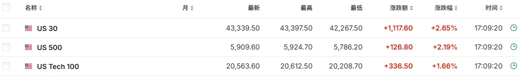 在特朗普宣布赢得2024年总统大选中后,美国股指期货周三飙升。截至发稿,道琼斯期货上涨1117点,涨幅2.65%,标普尔500期货上涨126点,涨幅2.19%,纳斯达克100期货上涨336点,涨幅1.66%。其他特朗普政策相关性较高的板块也出现了波动。
