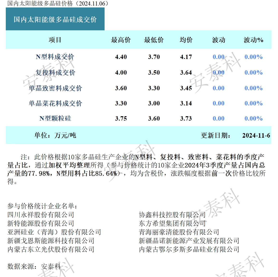 智通财经APP获悉,11月6日,硅业分会发文称,本周多晶硅价格持平。n型棒状硅成交价格区间维持至3.70-4.40万元/吨,成交均价为4.17万元/吨;P型单晶致密料成交价格区间维持在3.30-3.60万元/吨,成交均价为3.45万元/吨;N型颗粒硅成交价格区间维持至3.60-3.75万元/吨,成交均价为3.73万元/吨。