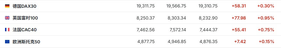 2. 截至发稿,德国DAX指数涨0.30%,英国富时100指数涨0.95%,法国CAC40指数涨0.75%,欧洲斯托克50指数涨0.15%。