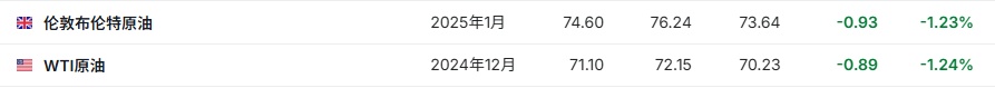 3. 截至发稿,WTI原油跌1.24%,报71.10美元/桶。布伦特原油跌1.23%,报74.60美元/桶。