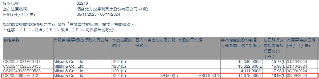 智通财经APP获悉,香港联交所最新资料显示,9月2日,Mitsui Co.,Ltd减持安德利果汁(02218)3.95万股,每股作价8.3072港元,总金额为32.81344万港元。减持后最新持股数目为1487.85万股,最新持股比例为18.96%。