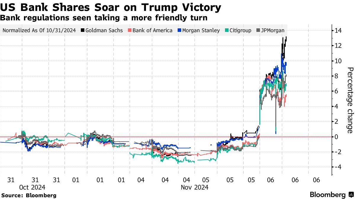 分析师指出,随着监管环境的改善,银行股的审查过程可能会变得更加友好和透明。特朗普的胜利还为美国银行老板们带来了一系列好消息,包括对应对利率下降环境和美联储实现经济软着陆能力的乐观预期。这一切都帮助KBW银行指数今年迄今上涨了近41%。