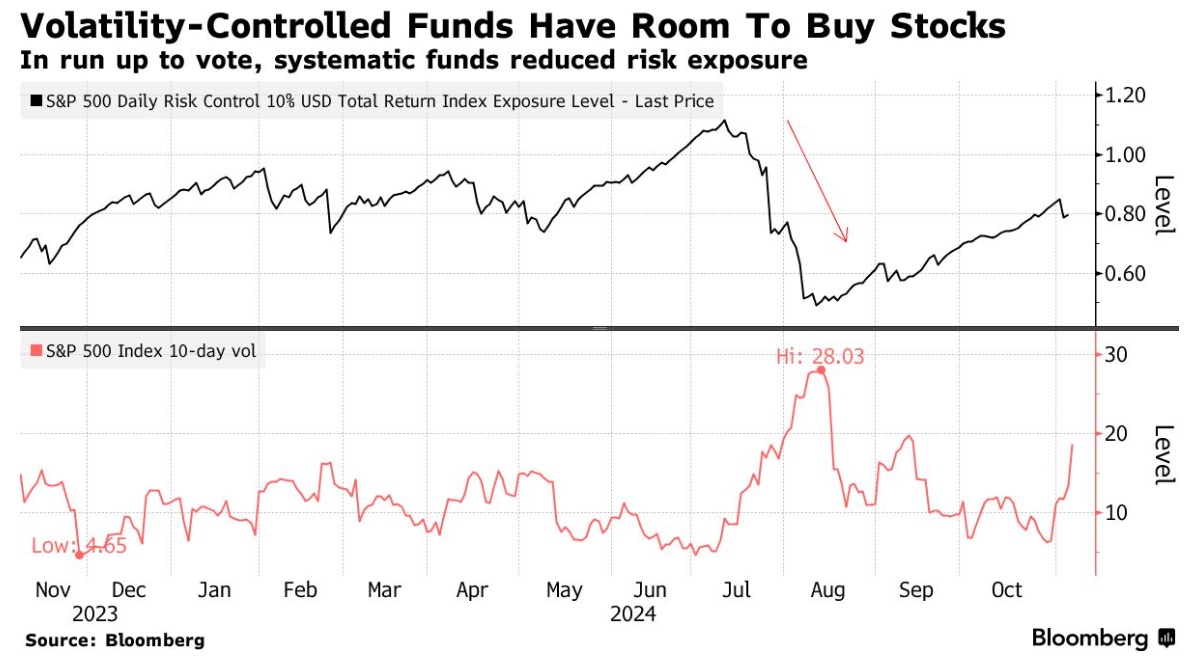相反,特朗普的明显胜利推动了VIX 指数创下 2021 年以来第二大单日跌幅,而标准普尔 500 指数上涨了 2.5%。这些举措迫使系统性倾向的基金通过投入股票来重新平衡,形成了一个技术驱动的反馈循环,这增加了推动股市上涨的其他力量。