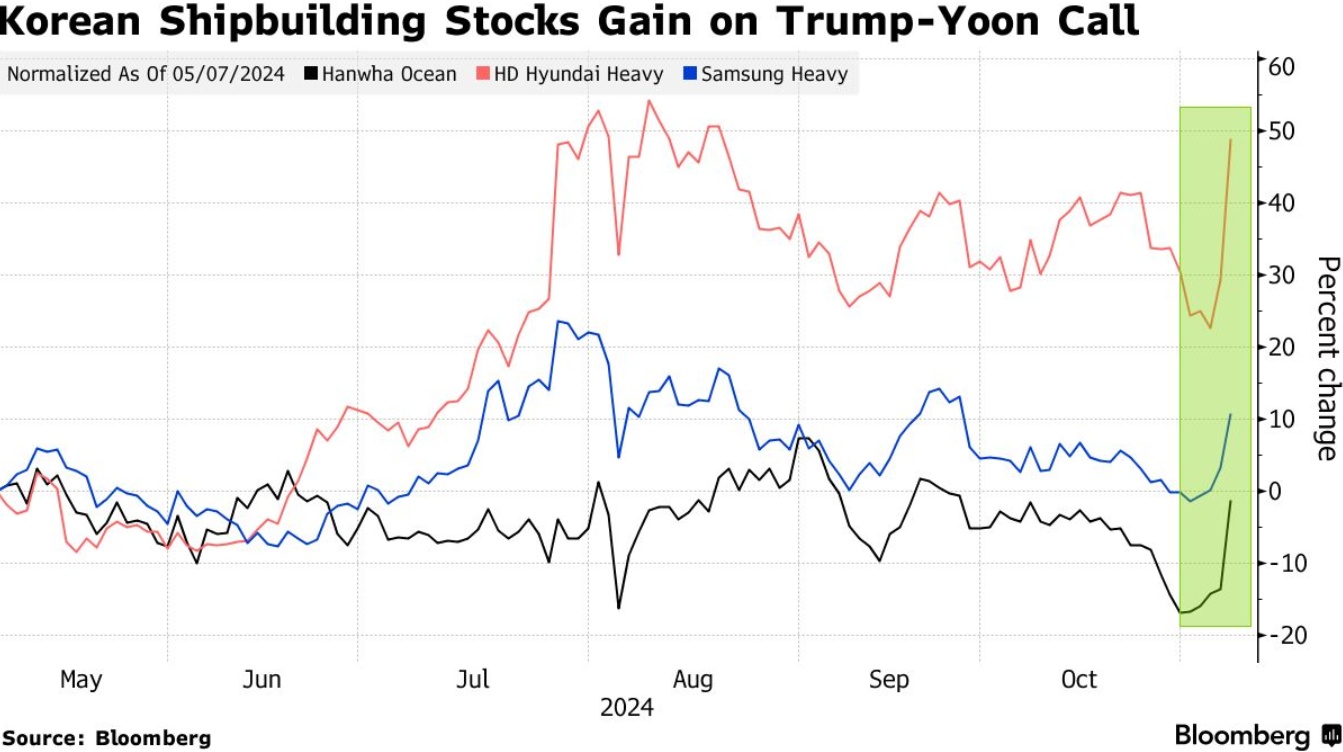在韩国总统尹锡悦向特朗普致电祝贺当选美国总统之后,韩国造船业超级巨头韩华海洋(Hanwha Ocean)股价大涨15%,一举创下4月18日以来的股价最高点。另一造船巨头韩国现代重工(HD Hyundai Heavy )股价大幅上涨16%,三星重工(Samsung Heavy Industries Co.)股价上涨8.4%。