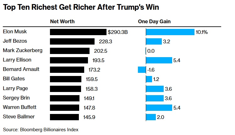特朗普宣布获胜后,全球前十大富豪变得更富有