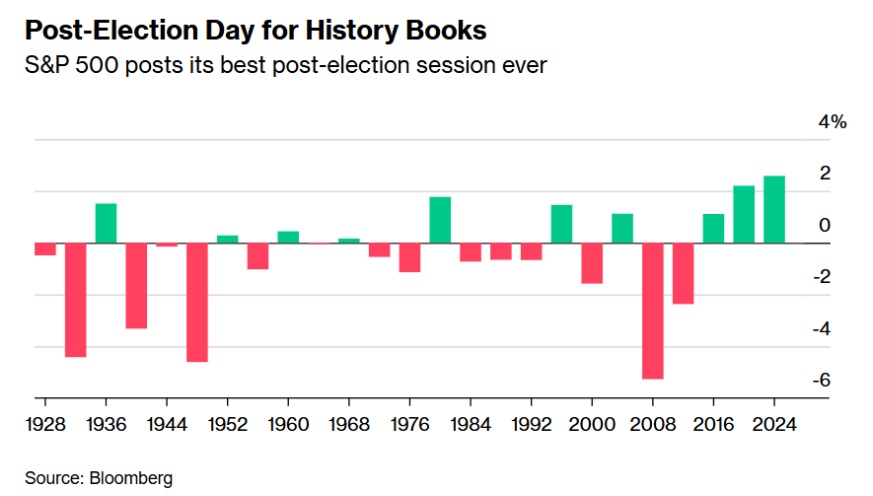 这些全球超级富豪们的大部分收益都归因于美国股市一夜间大幅飙升,这全面凸显出特朗普重返白宫后将实施有利于降低公司税收和放松监管的议程相关的押注。标普500指数截至周三美股收盘上涨2.5%,收于5929.04点,涨幅创下历史上最好的总统选举后当日基准指数表现,而美元汇率也跟随大幅上涨。