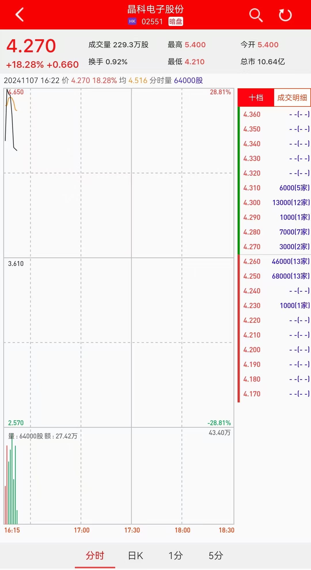 智通财经APP获悉,晶科电子股份(02551)将于11月8日(周五)在香港挂牌。截至发稿,利弗莫尔证券暗盘交易显示报价4.27港元,较招股价3.61港元上涨18.28%;每手1000股,不计手续费,每手赚660港元。