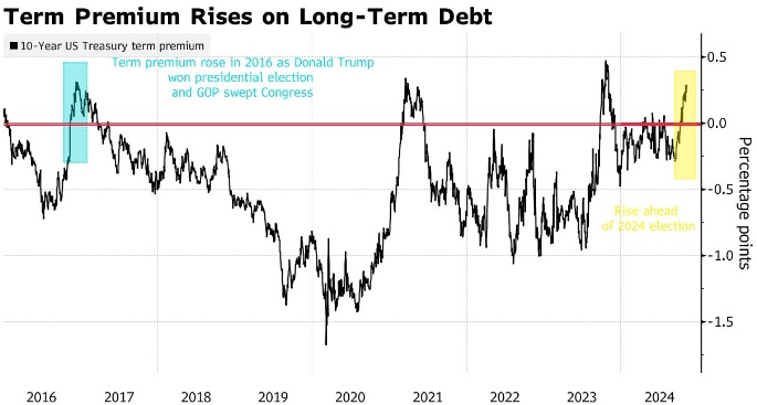 在周二投票之前,美债收益率和通胀预期已经在上升。10年期盈亏平衡利率(衡量长期通胀走向的市场指标)飙升至2.43%的高位,为今年4月以来的最高水平。自9月以来,随着美联储当月降息50个基点后经济表现出弹性,以及特朗普获胜的前景在博彩市场上升,该指标一直在上升。