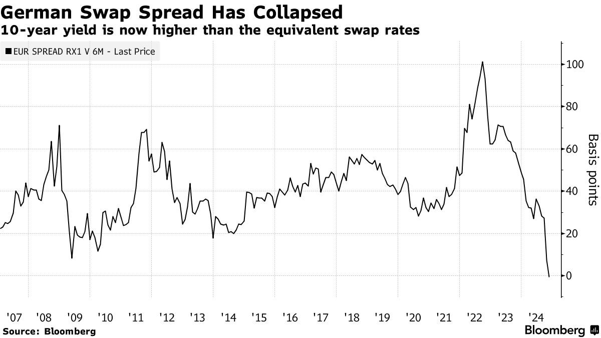 智通财经APP获悉,德国十年期国债收益率首次升至十年期互换利率上方,原因是交易员在德国执政联盟垮台后准备迎接可能出现的更多债券发售。债券收益率与同期互换利率之差是衡量债券未来发行量的重要指标。随着市场预期更多的债券抛售,债券收益率相对于同期互换利率往往会走高。德国商业银行策略师Hauke Siemssen表示:“德国执政联盟的垮台似乎将加剧最近的债券价格下跌。”策略师指出,在反对放松严格限制政府借贷这一规定的财政部长林德纳(Christian Lindner)被解职后,“通往更多债务的道路可能会变得更容易”。