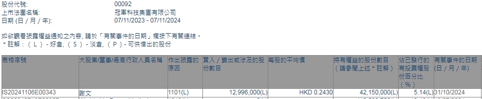 智通财经APP获悉,香港联交所最新资料显示,10月31日,谢文增持冠军科技集团(00092)1299.6万股,每股作价0.243港元,总金额约为315.80万港元。增持后最新持股数目为4215万股,最新持股比例为5.14%。