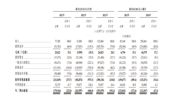 财务方面,2021年、2022年、2023年及2024年截至6月30日止六个月,希迪智驾实现收入分别约为人民币7738.5万元、3105.6万元、1.33亿元、2.58亿元;同期亏损约人民币1.795亿元、2.63亿元、2.55亿元、1.23亿元。