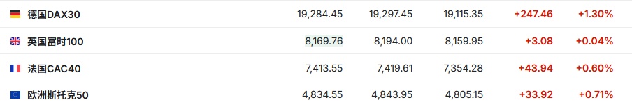 2. 截至发稿,德国DAX指数涨1.30%,英国富时100指数涨0.04%,法国CAC40指数涨0.60%,欧洲斯托克50指数涨0.71%。