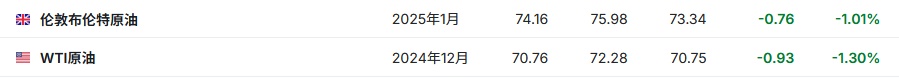 3. 截至发稿,WTI原油跌1.30%,报70.76美元/桶。布伦特原油跌1.01%,报74.16美元/桶。