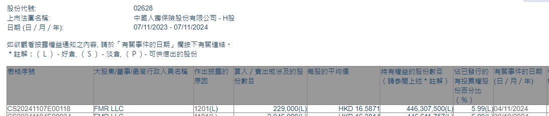 智通财经APP获悉,香港联交所最新资料显示,11月4日,FMR LLC减持中国人寿(02628)22.9万股,每股作价16.5871港元,总金额约为379.845万港元。减持后最新持股数目为4.46亿股,最新持股比例为5.99%。