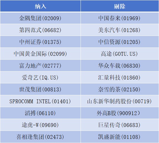 MSCI全球小盘股指数于中国地区纳入11只个股,其中10只港股分别为滔搏(06110)、途虎-W(09690)、中国黄金国际(02099)、第四范式(06682)、中州证券(01375)、金隅集团(02009)、富力地产(02777)、世茂集团(00813)、SPROCOMM INTEL(01401)、喜相逢集团(02473),另一只为中概股爱奇艺(IQ.US);