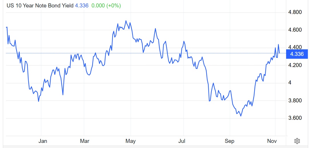 然而,国债市场确认为长期端美债的收益率水平将远高于上述经过一年降息周期后的目标利率区间,有着“全球资产定价之锚”称号的10年期美债收益率周四收于4.33%,近期10年期美债收益率从9月的低点3.60%大幅跃升,11月一度高达4.50%。