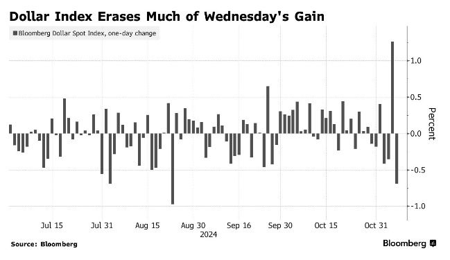 特朗普的当选被视为对美元有利,因为他的贸易政策可能会减缓美联储放松货币政策的步伐。美元指数周三升至一年来的最高水平。