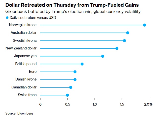 智通财经APP获悉,周四,美元创下自8月以来的最大跌幅,抹去了大部分前一天特朗普赢得美国总统大选引发的大幅上涨。