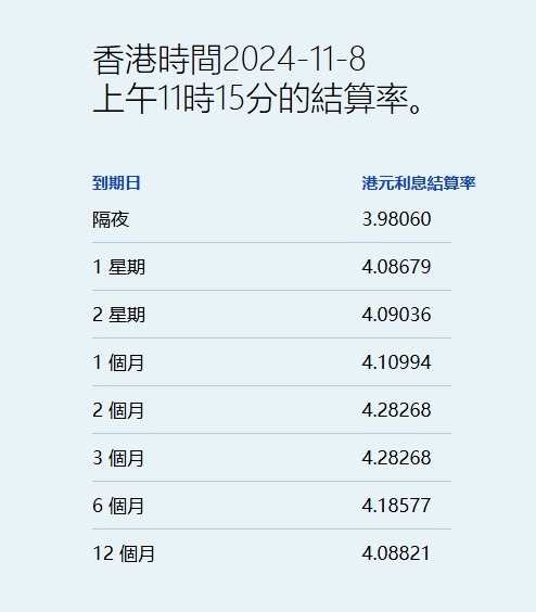 智通财经APP获悉,11月8日,美联储一如预期宣布减息25基点,亦是连续第二次会议减息。香港方面,港元拆息今日全线上扬,其中,隔夜息升23基点至3.9806%,为本月最高,一周拆息亦升穿4%,而与楼按相关的一个月拆息连升两天,报4.10994%,见一周新高。