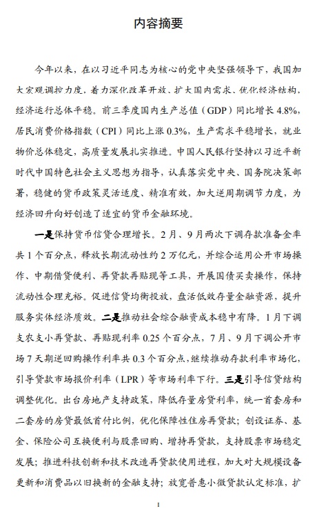 今年以来,在以习近平同志为核心的党中央坚强领导下,我国加大宏观调控力度,着力深化改革开放、扩大国内需求、优化经济结构,经济运行总体平稳。前三季度国内生产总值(GDP)同比增长4.8%,居民消费价格指数(CPI)同比上涨0.3%,生产需求平稳增长,就业物价总体稳定,高质量发展扎实推进。中国人民银行坚持以习近平新时代中国特色社会主义思想为指导,认真落实党中央、国务院决策部署,稳健的货币政策灵活适度、精准有效,加大逆周期调节力度,为经济回升向好创造了适宜的货币金融环境。