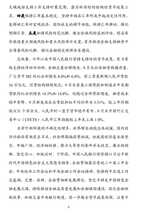 当前外部环境的不确定性增多,世界增长动能总体放缓,国内经济仍面临有效需求不足、社会预期偏弱等挑战。但我国经济基本面坚实,市场广阔、经济韧性强、潜力大等有利条件并未改变,要正视困难、坚定信心、积极应对。下阶段,中国人民银行将坚持以习近平新时代中国特色社会主义思想为指导,全面贯彻落实党的二十届三中全会、中央经济工作会议和中央金融工作会议精神,坚持稳中求进工作总基调,完整、准确、全面贯彻新发展理念,坚定不移走中国特色金融发展之路,持续推动金融高质量发展和金融强国建设,深化金融体制改革,加快完善中央银行制度,进一步健全货币政策框架。注重平衡好短期和长期、稳增长和防风险、内部均衡和外部均衡的关系,坚定坚持支持性的货币政策立场,加大货币政策调控强度,提高货币政策精准性,为经济稳定增长和高质量发展创造良好的货币金融环境。