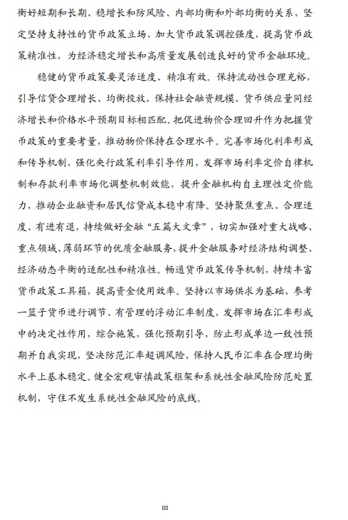 稳健的货币政策要灵活适度、精准有效。保持流动性合理充裕,引导信贷合理增长、均衡投放,保持社会融资规模、货币供应量同经济增长和价格水平预期目标相匹配。把促进物价合理回升作为把握货币政策的重要考量,推动物价保持在合理水平。完善市场化利率形成和传导机制,强化央行政策利率引导作用,发挥市场利率定价自律机制和存款利率市场化调整机制效能,提升金融机构自主理性定价能力,推动企业融资和居民信贷成本稳中有降。坚持聚焦重点、合理适度、有进有退,持续做好金融“五篇大文章”,切实加强对重大战略、重点领域、薄弱环节的优质金融服务,提升金融服务对经济结构调整、经济动态平衡的适配性和精准性。畅通货币政策传导机制,持续丰富货币政策工具箱,提高资金使用效率。坚持以市场供求为基础、参考一篮子货币进行调节、有管理的浮动汇率制度,发挥市场在汇率形成中的决定性作用,综合施策,强化预期引导,防止形成单边一致性预期并自我实现,坚决防范汇率超调风险,保持人民币汇率在合理均衡水平上基本稳定。健全宏观审慎政策框架和系统性金融风险防范处置机制,守住不发生系统性金融风险的底线。