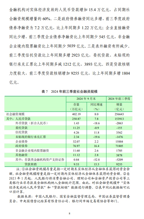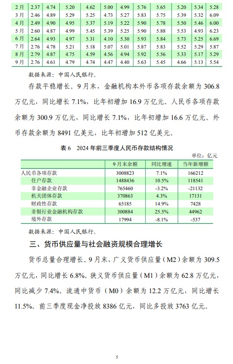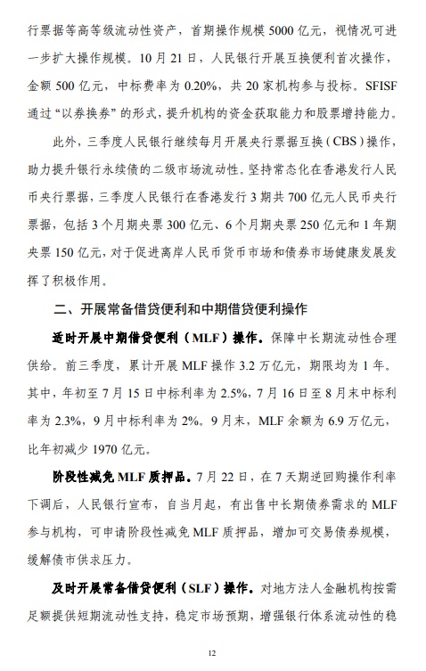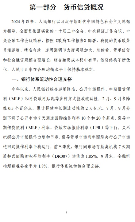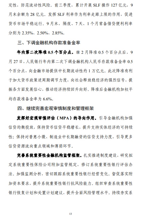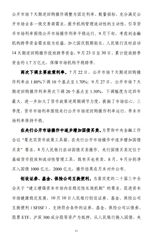 一是保持货币信贷合理增长。2月、9月两次下调存款准备金率共1个百分点,释放长期流动性约2万亿元,并综合运用公开市场操作、中期借贷便利、再贷款再贴现等工具,开展国债买卖操作,保持流动性合理充裕。促进信贷均衡投放,盘活低效存量金融资源,提升服务实体经济质效。二是推动社会综合融资成本稳中有降。1月下调支农支小再贷款、再贴现利率0.25个百分点,7月、9月下调公开市场7天期逆回购操作利率共0.3个百分点,继续推动存款利率市场化,引导贷款市场报价利率(LPR)等市场利率下行。三是引导信贷结构调整优化。出台房地产支持政策,降低存量房贷利率,统一首套房和二套房的房贷最低首付比例,优化保障性住房再贷款;创设证券、基金、保险公司互换便利与股票回购、增持再贷款,支持股票市场稳定发展;推进科技创新和技术改造再贷款使用进程,加大对大规模设备更新和消费品以旧换新的金融支持;放宽普惠小微贷款认定标准,扩大碳减排支持工具支持对象范围,落实好存续的结构性货币政策工具。四是保持汇率基本稳定。坚持市场在汇率形成中起决定性作用,发挥好汇率对宏观经济、国际收支的调节功能,保持汇率弹性,强化预期引导。五是加强风险防范化解。健全金融风险监测评估,稳妥有序推进重点领域风险和重点风险项目处置,有序推进金融支持融资平台债务风险化解,强化金融稳定保障体系建设。