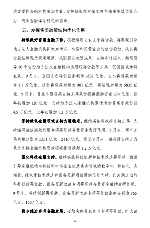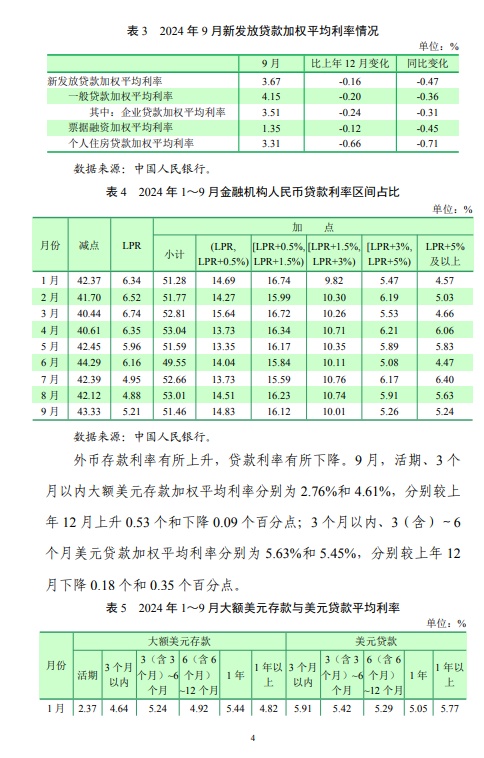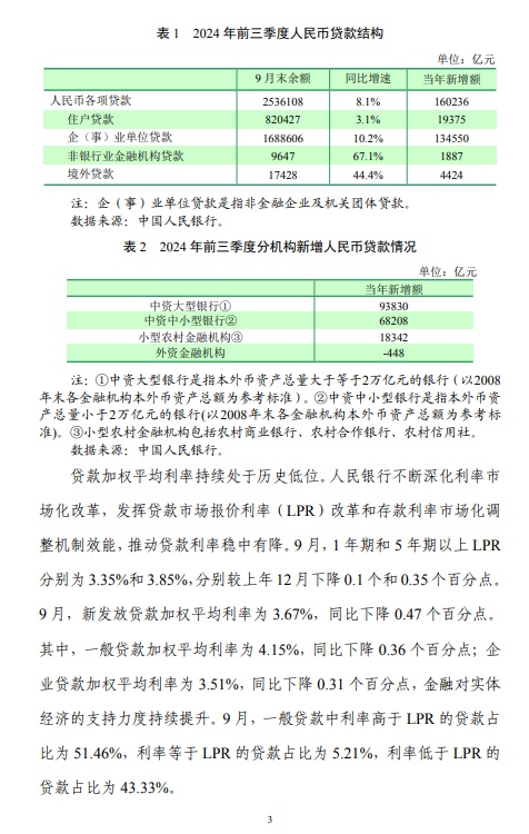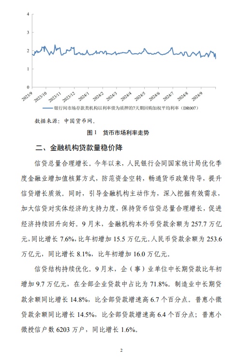 总体看,今年以来中国人民银行坚持支持性的货币政策,有力有效支持经济回升向好。金融总量合理增长,9月末社会融资规模存量、广义货币M2同比分别增长8.0%和6.8%,前三季度新增人民币贷款16万亿元。信贷结构持续优化,9月末普惠小微贷款和制造业中长期贷款同比分别增长14.5%和14.8%,均超过全部贷款增速。融资成本稳中有降,9月新发放企业贷款加权平均利率为3.51%,较上年同期低0.31个百分点。人民币对一篮子货币稳中有升,9月末中国外汇交易中心(CFETS)人民币汇率指数较上年末上涨1.0%。