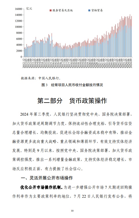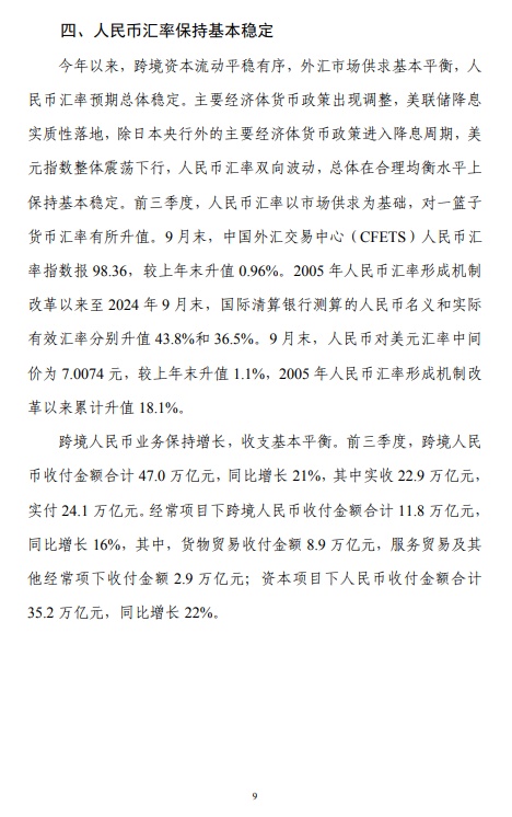 智通财经APP获悉,11月8日,中国央行发布2024年第三季度中国货币政策执行报告。其中提到,坚持以市场供求为基础、参考一篮子货币进行调节、有管理的浮动汇率制度,发挥市场在汇率形成中的决定性作用,综合施策,强化预期引导,防止形成单边一致性预期并自我实现,坚决防范汇率超调风险,保持人民币汇率在合理均衡水平上基本稳定。健全宏观审慎政策框架和系统性金融风险防范处置机制,守住不发生系统性金融风险的底线。