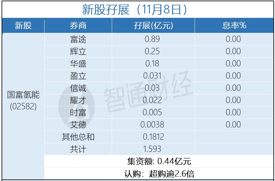 智通财经APP获悉,国富氢能(02582)正在招股中。截止11月8日,富途、信诚、耀才等券商合计为国富氢能借出1.593亿港元,超购逾2.6倍。