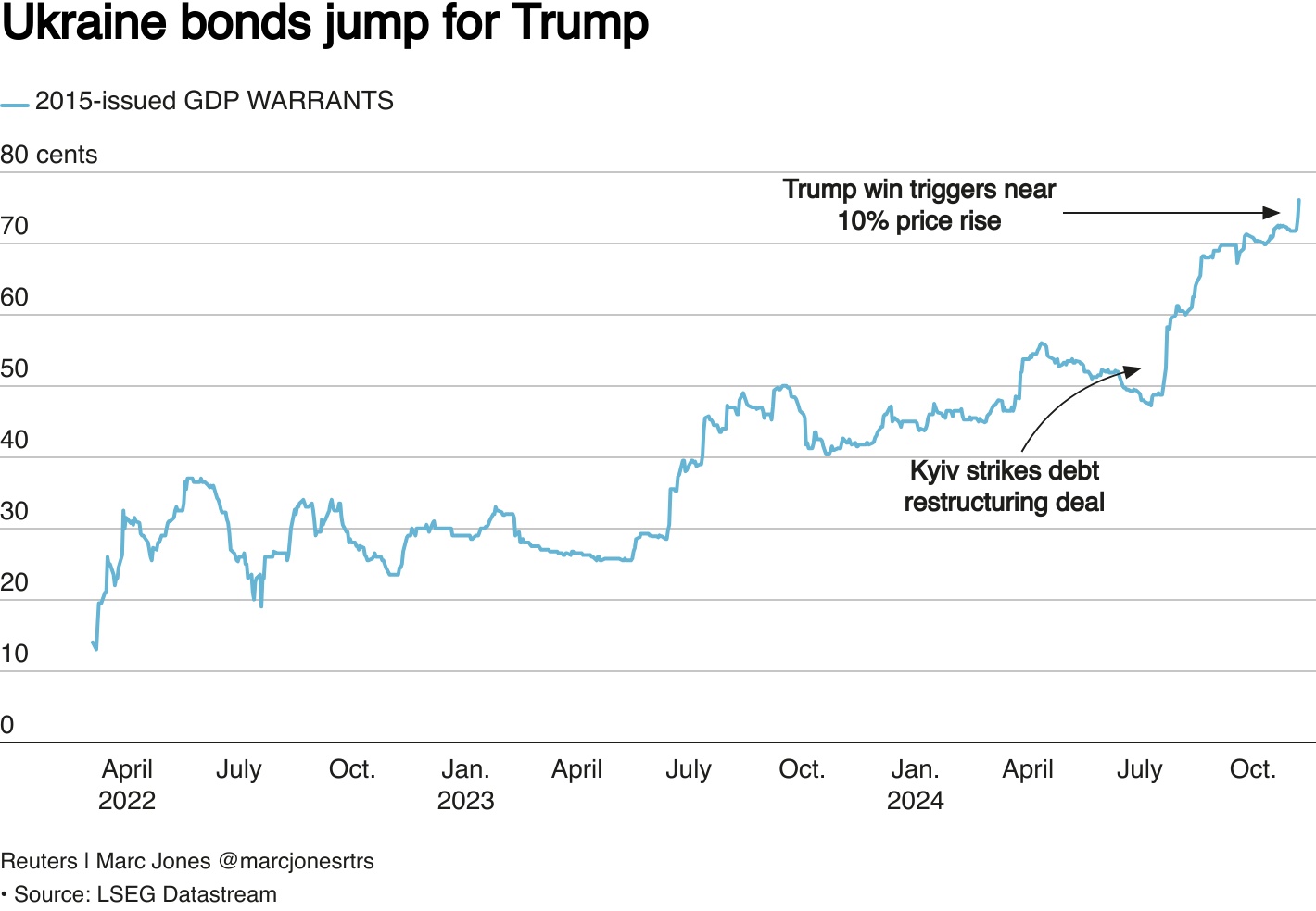 特朗普胜选后,乌克兰的国际债券和GDP权证大幅上涨,因为人们乐观地认为,特朗普可能会加速俄乌冲突的结束。与此同时,投资者还为特朗普与阿根廷总统米莱之间可能建立更密切的关系而感到乐观,阿根廷的股票和债券也出现了上涨。