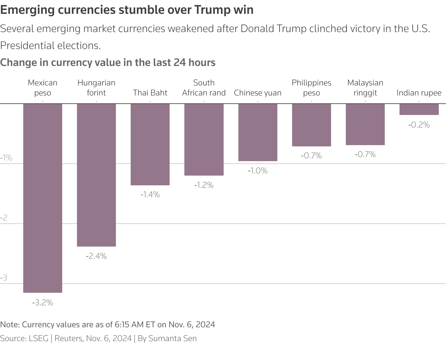 美元在美国大选结果出炉后大幅上涨,再加上对特朗普政府关税政策、潜在的大规模财政支出和美联储放缓降息的担忧,一系列新兴市场货币和债券遭到打压。