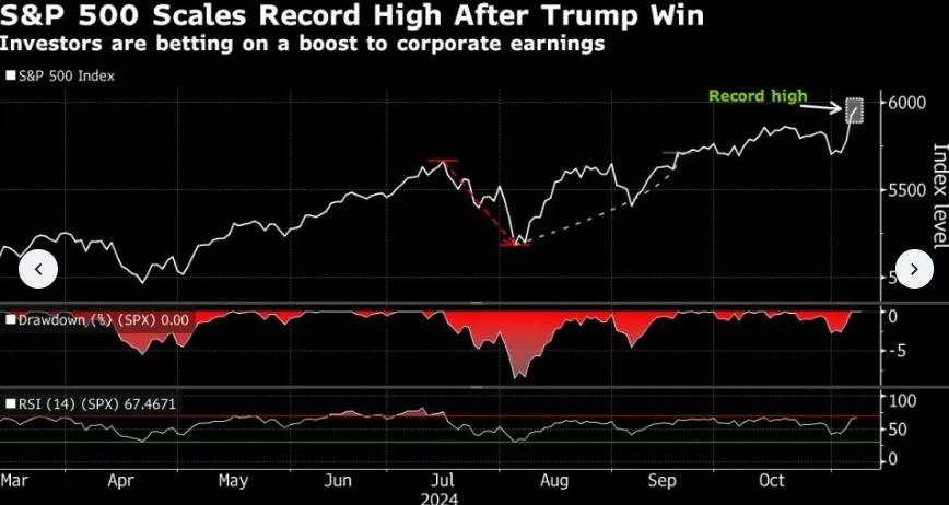 在美国大选结果公布和美联储再次降息之后,美国股市本周反弹至创纪录高位。标普500指数有望创下一年来最大单周涨幅。虽然特朗普降低企业税率的提议预计将提振企业收益,但投资者也担心,特朗普政府可能出台的关税和移民政策将再次引发通胀。10年期美国国债收益率最初在特朗普获胜后飙升,尽管此后已经回吐了大部分涨幅。