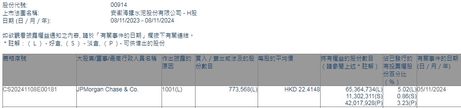 智通财经APP获悉,香港联交所最新资料显示,11月5日,摩根大通增持海螺水泥(00914)77.3568万股,每股作价22.4148港元,总金额约为1733.94万港元。增持后最新持股数目约为6536.47万股,最新持股比例为5.02%。