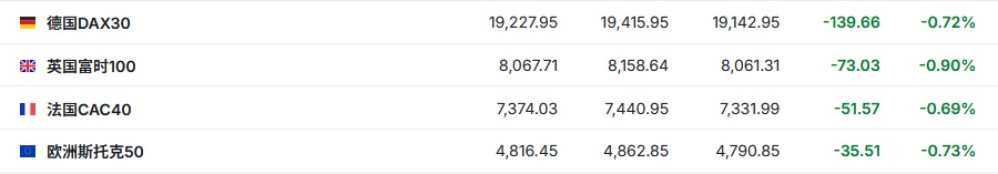 2. 截至发稿,德国DAX指数跌0.72%,英国富时100指数跌0.90%,法国CAC40指数跌0.69%,欧洲斯托克50指数跌0.73%。