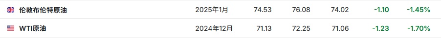 3. 截至发稿,WTI原油跌1.70%,报71.13美元/桶。布伦特原油跌1.45%,报74.53美元/桶。