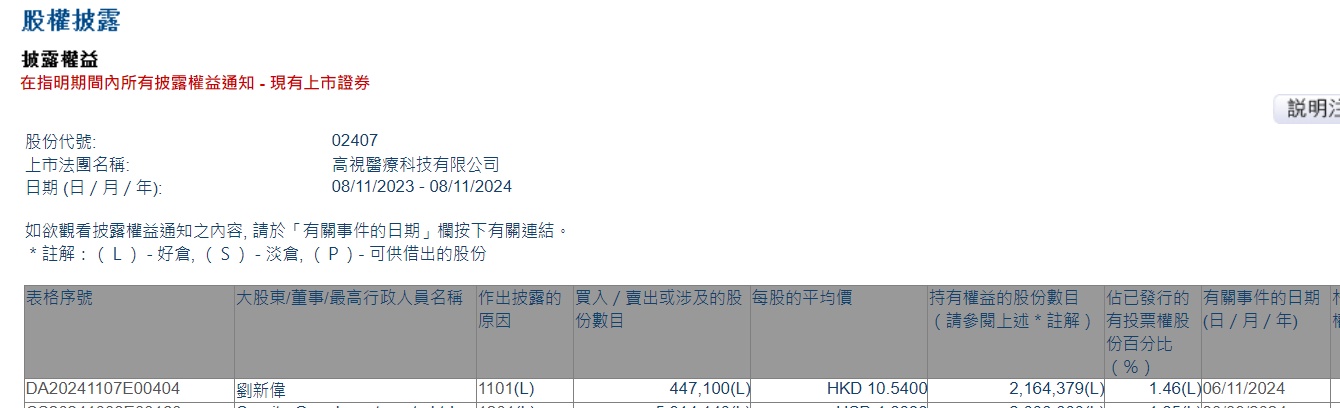 智通财经APP获悉,香港联交所最新资料显示,11月6日,执行董事刘新伟增持高视医疗(02407)44.71万股,每股作价10.54港元,总金额约为471.24万港元。增持后最新持股数目约为216.44万股,最新持股比例为1.46%。