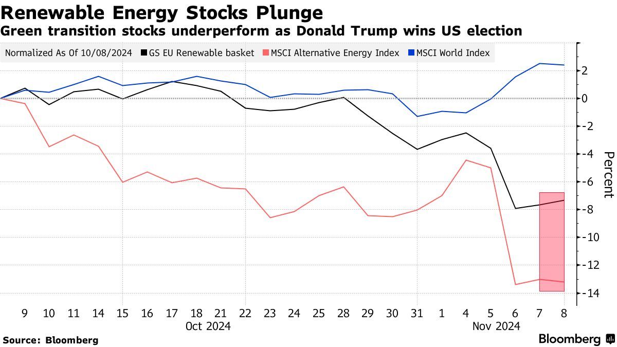 特朗普一直是化石等传统能源的拥护者。在这次选举期间,特朗普也曾多次强调要扩大石油和天然气开采,取消可再生能源政策。咨询机构伍德麦肯兹此前曾表示,特朗普获胜将危及美国预计的1万亿美元的低碳能源投资,美国电动车销量会下滑,风能、太阳能和储能项目必将延迟或停滞。