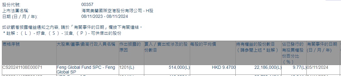 智通财经APP获悉,香港联交所最新资料显示,11月5日,Feng Global Fund SPC-Feng Global SP减持美兰空港(00357)51.4万股,每股作价9.47港元,总金额约为486.758万港元。减持后最新持股数目为2218.6万股,最新持股比例为9.77%。