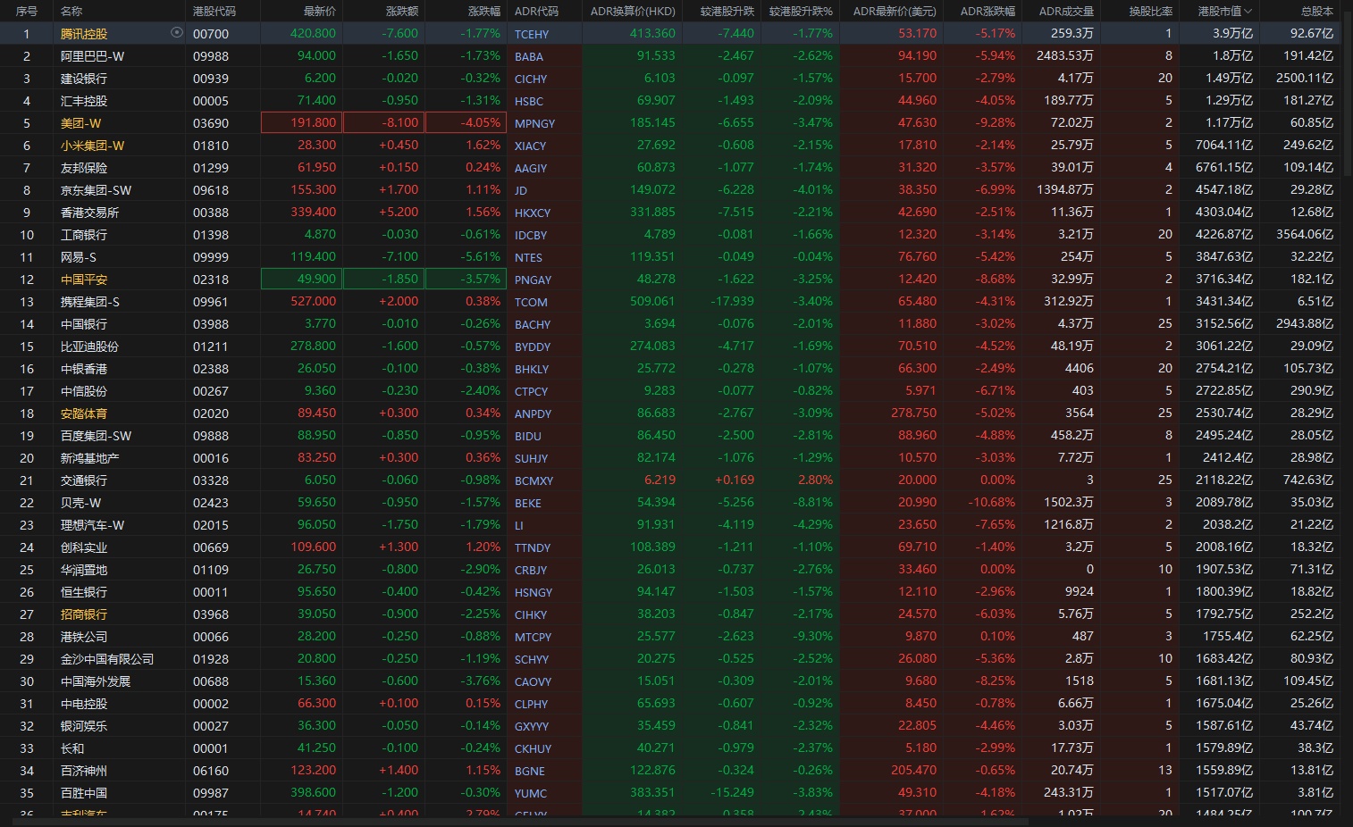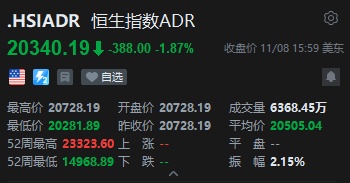 智通财经APP获悉,周五美股三大指数齐涨,恒生指数ADR下跌,按比例计算,收报20340.19点,较香港收市下跌388.00点或1.87%。